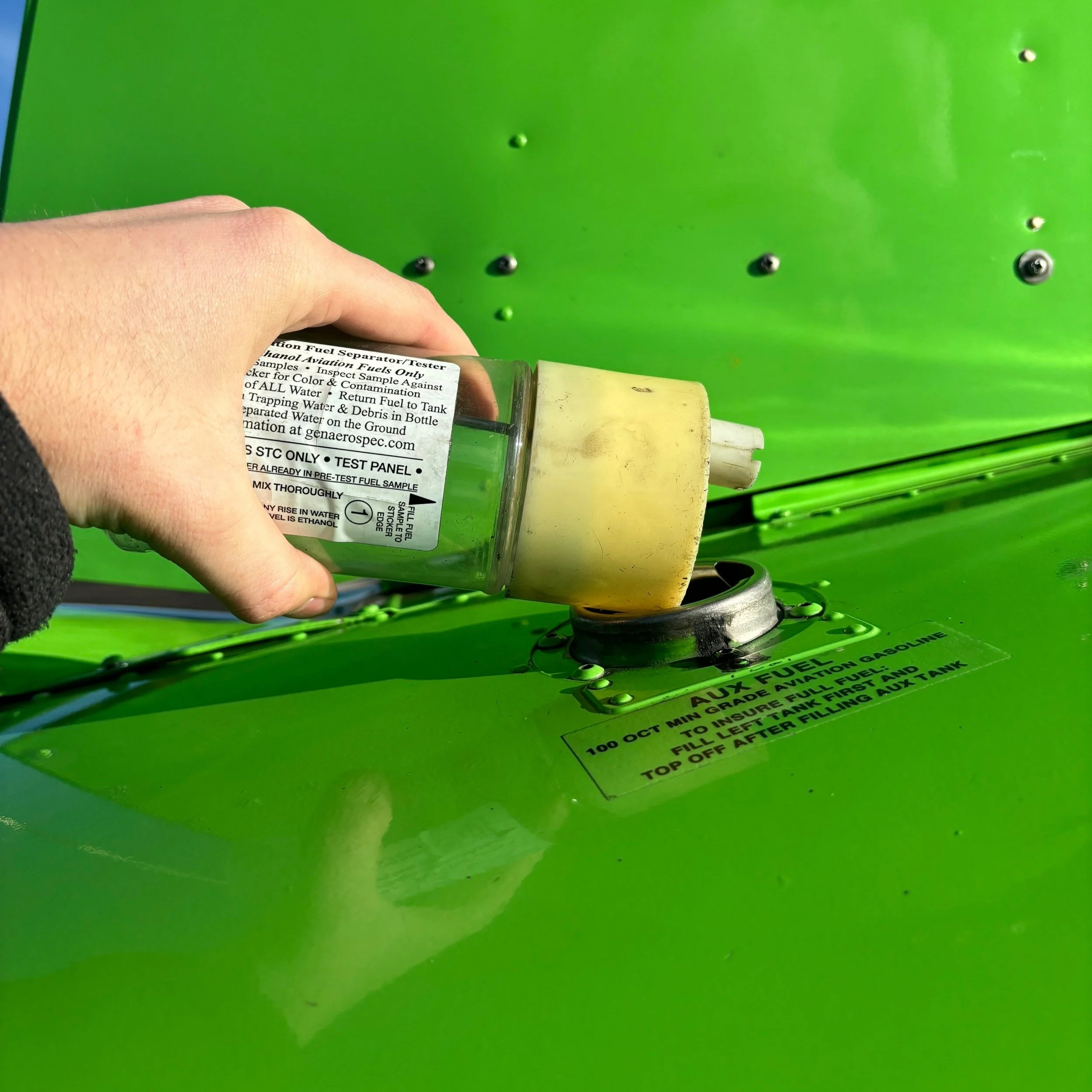 Push the end of the tube into the fuel test jar (found under the left seat)